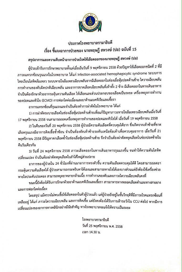 และคาดว่าจะสามารถควบคุมการติดเชื้อในปอดและลำไส้ได้ สรุปคืออาการที่มีข้อแทรกซ้อนอยู่ในขณะนี้คืออาการ ไตวาย การติดเชื้อที่เท้าขวา ติดเชื้อที่ปอด และลำไส้ ที่ต้องดูแลอย่างใกล้ชิดโดยรวมผู้ป่วยมีอาการดีขึ้นแต่ยังไม่พ้นวิกฤต