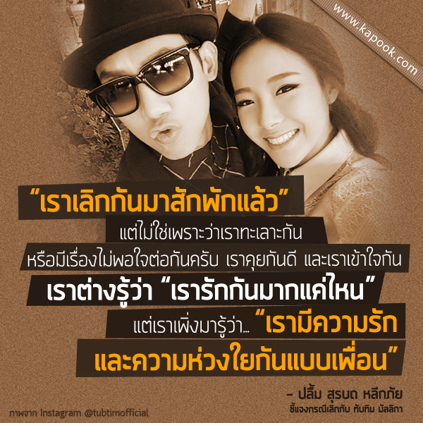 อาจเป็นเพราะเราเริ่มกันมาแบบเพื่อน เราห่วงใยกัน ดูแลกัน ผูกพันกัน เราเข้าใจกัน เราเลยคิดว่ามันเป็นความรักแบบคนรัก แต่หลังจากมาใช้ชีวิตอยู่ด้วยกัน เราจึงเพิ่งเข้าใจว่า "มันไม่ใช่แบบคนรักแต่มันเป็นแบบเพื่อน มันไม่ใช่ในรูปแบบชีวิตคู่" ทับทิมคือเพื่อนที่แสนดีของผม เราดีต่อกันมาตลอด และต่อจากนี้เราก็จะดีต่อกัน กราบขออภัยทุกท่านที่ติดตามนะครับ ขอให้ทุกท่านโปรดเข้าใจและเคารพในการตัดสินใจของเราทั้งสองด้วย ทั้งหมดมันมีเพียงเท่านี้ครับ ขอบคุณครับ/ค่ะ...ปลื้ม/ทับทิม"