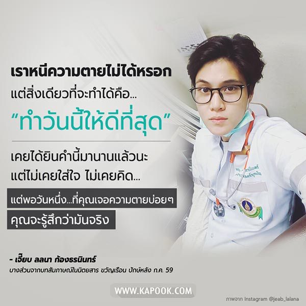 ทั้งนี้ในเพจดังกล่าว ระบุว่า ข้อดีอย่างหนึ่งของอาชีพหมอนั้น ที่คนทั่วไปอาจนึกไม่ถึง นั่นก็คือการสัมผัสและได้รับรู้ถึงความเป็นความตาย บ่อย ๆ ซ้ำ ๆ ทุกวัน ทำให้รู้ซึ้งถึงคุณค่าชีวิตได้อย่างมากมาย