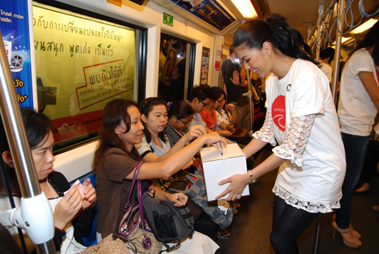 บรรยากาศงานรับริจาคเป็นไปอย่างชื่นมื่นตั้งแต่เช้าตรู่โดยมีประชาชนที่ทราบข่าวงานมาเข้าคิวรอซื้อเสื้องานล่วงหน้านานกว่าสามชั่วโมง แต่พอเริ่มเปิดขายไม่ถึงครึ่งชั่วโมงเสื้อก็หมดลงอย่างรวดเร็วทำให้ประชาชนอีกจำนวนมากมายที่ไม่ได้เสื้อ แต่นั่นก็ไม่ได้สร้างความผิดหวังให้พวกเขาแม้แต่น้อยพวกเขายังคงยืนต่อแถวเพื่อบริจาคเงินต่อ ถึงแม้จะไม่ได้เสื้อที่เป็นที่ระลึกของงานกลับบ้านไปก็ตาม ในขณะเดียวกันเหล่าดารานักแสดงและศิลปินจากทุกสังกัดก็ได้แบ่งสายกันเป็นกรุ๊ปๆ ช่วยกันเดินถือเดินถือกล่องรับบริจาคบริเวณเดินจากสยามพารากอนไปขึ้นรถไฟฟ้าBTS และ MRT โดยได้รับการตอบรับเป็นอย่างดีจากประชาชนทุกคนที่อยู่บริเวณใกล้เคียงทุกสถานีเป็นที่สนุกสนานทั้งคนผู้รับและผู้ให้ ในระหว่างที่ดาราศิลปินบางส่วนได้แบ่งสายการเดินทางรับบริจาคทางสถานีรถไฟฟ้า