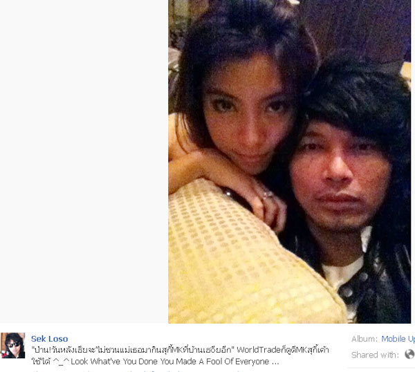 สืบเนื่องจากกรณีที่ กานต์-วิภากร ศุขพิมาย อดีตภรรยา "เสก โลโซ" เสกสรร ศุขพิมาย นักร้องชื่อดัง โพสต์เฟซบุ๊ก แฉภาพพฤติกรรมเสีย ๆ หาย ๆ ของอดีตสามีนั้น ล่าสุด รายงานข่าวจากคนใกล้ชิดนักร้องชื่อดัง เปิดเผยว่า เบื้องต้น เสก โลโซ ได้ทำความเข้าใจกับผู้ใหญ่ค่ายแกรมมี่ ต้นสังกัดแล้ว และเก็บตัวเงียบในบ้านพักหมู่บ้านนันทวรรณ ย่านวัชรพล เพื่อซุ่มทำอัลบั้มใหม่ แต่ขณะนี้ เสก โลโซ ออกจากประเทศไทยไปกรุงเวียงจันทน์ ประเทศลาว พร้อมกับน้องอ้อม แฟนสาวคนใหม่ เพื่อหลบกระแสข่าวอื้อฉาว อย่างไรก็ตาม นักร้องดังยังโพสต์เฟซบุ๊กรับปากแฟนเพลงว่าจะไปแสดงคอนเสิร์ตทุกงานที่รับไว้