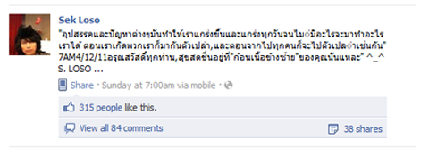 อย่างไรก็ตาม ในวันเดียวกันนั้น ที่เฟซบุ๊กของ เสก โลโซ ที่มีชื่อว่า "sekloso (seklosolovesongs)" ได้โพสต์ข้อความว่า "อุปสรรคและปัญหาต่าง ๆ มันทำให้เราแกร่งขึ้นและแกร่งทุกวัน จนไม่มีอะไรจะมาทำอะไรเราได้ ตอนเราเกิดพวกเราก็มากันตัวเปล่า, และตอนจากไปทุกคนก็จะไปตัวเปล่าเช่นกัน" และข้อความ "อรุณสวัสดิ์ทุกท่าน, สุขสดชื่นอยู่ที่ ′ก้อนเนื้อข้างซ้าย′ ของคุณนั่นแหละ ^_^ S. LOSO 7AM 4/12/11"
