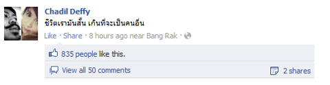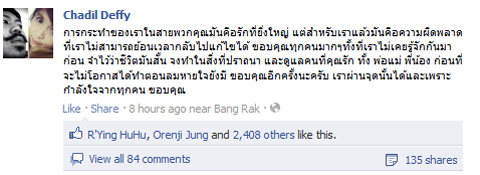 Chadil Deffy : การกระทำของเราในสายพวกคุณมันคือรักที่ยิ่งใหญ่ แต่สำหรับเราแล้วมันคือความผิดพลาดที่เราไม่สามารถย้อนเวลากลับไปแก้ไขได้ ขอบคุณทุกคนมากๆทั้งที่เราไม่เคยรู้จักกันมาก่อน จำไว้ว่าชีวิตมันสั้น จงทำในสิ่งที่ปราถนา และดูแลคนที่คุณรัก ทั้ง พ่อแม่ พี่น้อง ก่อนที่จะไม่โอกาสได้ทำตอนลมหายใจยังมี ขอบคุณอีกครั้งนะครับ เราผ่านจุดนั้นได้และเพราะกำลังใจจากทุกคน ขอบคุณ