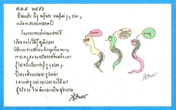 สมเด็จพระเทพฯ พระราชทานพรปีมะเส็ง 2556 "ปีมะเส็ง ปีงู จงรู้จริง อย่ารู้แค่งู ๆ ปลา ๆ แล้วจะสบายตลอดปี" พร้อมภาพฝีพระหัตถ์