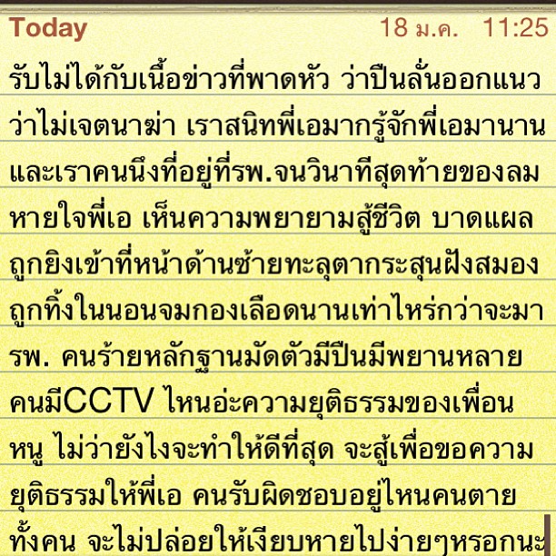 - เมื่อเช้าพี่ที่สนิทของหนูโดนยิงที่ทองหล่อ แต่เรื่องกำลังจะเงียบ หนูขอความยุติธรรมให้กับพี่หนูบ้างนะค่ะ สงสารแม่เค้าที่ต้องเห็นลูกจากไป