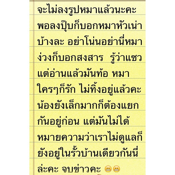 งานนี้ทำเอาเจ้าตัวสาว เอ๋ พรทิพย์ ต้องออกมาโพสต์อินสตาแกรมระบายว่าท้อ และจะไม่ลงรูปหมาแล้ว เพราะพอลงปุ๊บก็มีคนมาบอกว่าเป็นหมาหัวเน่าบ้าง สงสารหมาบ้าง รู้ว่าแซวแต่อ่านแล้วมันท้อ หมาใครใครก็รัก ไม่ทิ้งอยู่แล้ว แต่ตอนนี้น้องยังเล็กมากต้องแยกกันอยู่ก่อน ซึ่งก็ไม่ได้หมายความว่าเธอไม่ดูแล เพราะยังอยู่ในรั้วบ้านเดียวกันอยู่