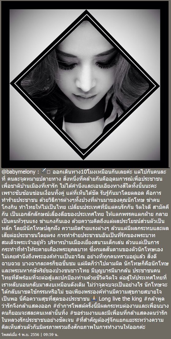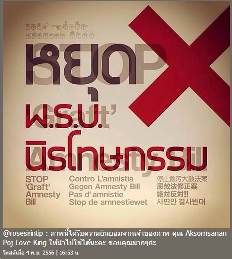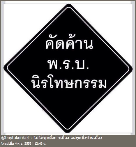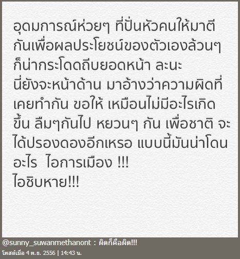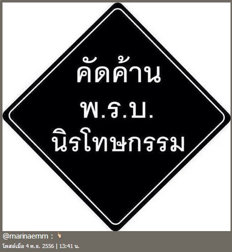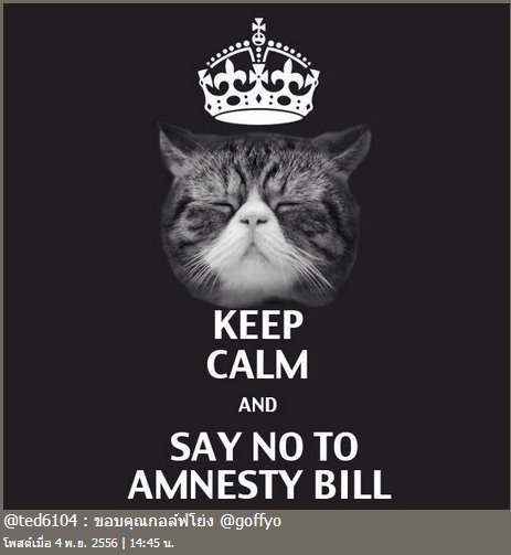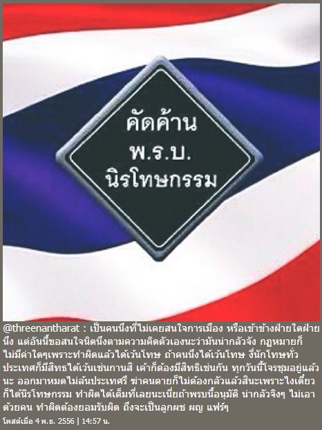 ตรี นันทรัตน์ ชาวราษฎร์ : เป็นคนนึงที่ไม่เคยสนใจการเมือง หรือเข้าข้างฝ่ายใดฝ่ายนึง แต่อันนี้ขอสนใจนิดนึงตามความคิดตัวเองนะว่ามันน่ากลัวจัง กฎหมายก็ไม่มีค่าใด ๆ เพราะทำผิดแล้วได้เว้นโทษ ถ้าคนนึงได้เว้นโทษ งี้นักโทษทั่วประเทศก็มีสิทธิได้เว้นเช่นกันสิ เค้าก็ต้องมีสิทธิเช่นกัน ทุกวันนี้โจรชุมอยู่แล้วนะ ออกมาหมดไม่ล้นประเทศรึ ฆ่าคนตายก็ไม่ต้องกลัวแล้วสินะเพราะไงเดี๋ยวก็ได้นิรโทษกรรม ทำผิดได้เต็มที่เลยนะเนี่ยถ้าพรบนี้อนุมัติ น่ากลัวจิง ๆ ไม่เอาด้วยคน ทำผิดต้องยอมรับผิด ถึงจะเป็นลูกผช ผญ แฟร์ ๆ