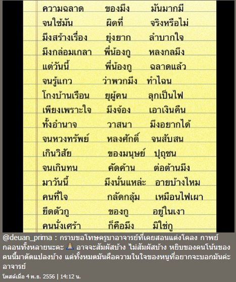 เดือน ไปรมา รัชตะ : กราบขอโทษครูบาอาจารย์ที่เคยสอนแต่งโคลง กาพย์ กลอนทั้งหลายนะคะ อาจจะสัมผัสบ้าง ไม่สัมผัสบ้าง หยิบของคนโน้นของคนนี้มาดัดแปลงบ้าง แต่ทั้งหมดมันคือความในใจของหนูที่อยากจะบอกมันค่ะอาจารย์