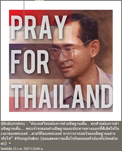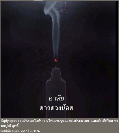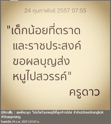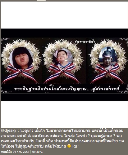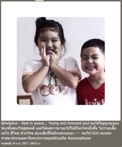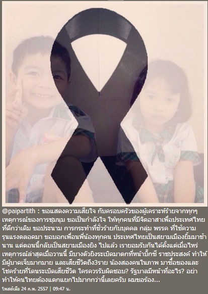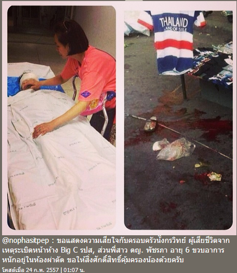 สถานการณ์ทางการเมืองของไทยกำลังดุเดือด จากเหตุโจมตีม็อบ กปปส. จนมีผู้เสียชีวิตและบาดเจ็บจำนวนมาก โดยล่าสุดมีผู้เสียชีวิตที่เป็นเด็กด้วย ทั้งจากเหตุกราดยิงและปาระเบิดใส่ เวที กปปส. จังหวัดตราด เมื่อวันที่ 22 กุมภาพันธ์ 2557 และเหตุระเบิดหน้าบิ๊กซีราชดำริ ใกล้เวทีของกลุ่มผู้ชุมนุม กปปส. ราชประสงค์ เมื่อช่วงเย็นวันที่ 23 กุมภาพันธ์ 2557 ที่มีผู้เสียชีวิตแล้ว 3 ราย คือ ด.ญ.พัชรากร ยศอุบล หรือ น้องเค้ก วัย 6 ขวบ และน้องชาย น้องเคน ด.ช.กรวิทย์ ยศอุบล วัย 5 ขวบ และ น.ส.ฐิพาพรรณ สุวรรณมณี อายุ 59 ปี