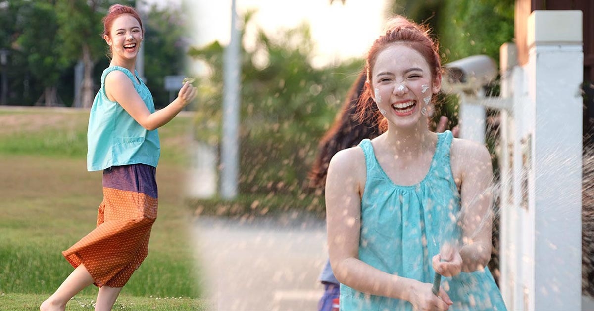 พลอยชมพู ในชุดเสื้อคอกระเช้า กางเกงผ้าซิ่น งามอย่างไทย สดใสมาก