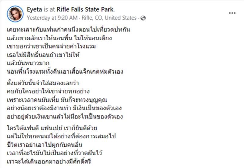 อายตา บิวตี้บล็อกเกอร์และยูทูบเบอร์คนดัง เล่าครั้งหนึ่งเคยเจอแฟนเก่าทวงบุญคุณ แฟนเก่าให้นอนพื้น ไม่ให้นอนบนเตียง เพราะเขาคือคนที่จ่ายค่าโรงแรม บทเรียนครั้งใหญ่ อย่าอยู่ด้วยเงินเขาจนเราไม่มีอะไรเป็นของตัวเอง เรามักจะคุ้นภาพของ อายตา บิวตี้บล็อกเกอร์คนดัง ในแบบสาวสวย แซ่บ มั่นใจ สายฝอ พร้อมมากับความสนุกสนาน แต่ใครจะรู้ว่าครั้งหนึ่งในชีวิตของอายตา เคยถูกแฟนไล่ให้ไปนอนพื้น มีเพียงแค่แจ็กเก็ตคลุมตัวเอง เพราะแฟนมองว่าเขาคือคนจ่ายค่าโรงแรม เธอไม่มีสิทธิ์มานอนบนเตียง ทั้งนี้ อายตา เผยในเฟซบุ๊ก ว่า เธอและแฟนเก่าคนหนึ่งเคยไปเที่ยวต่างประเทศด้วยกัน และเขาก็ผลักให้อายตาไปนอนที่พื้น ไม่ให้นอนบนเตียง เพราะเขาบอกว่า เขาคือคนที่จ่ายค่าโรงแรม เธอไม่มีสิทธิ์มานอนถ้าเขาไม่ให้นอน ตอนนั้นบนพื้นโรงแรมก็หนาว ต้องเอาแจ็กเก็ตห่มตัวเอง อายตาเผยว่า ตั้งแต่วันนั้นก็จำขึ้นใจเลยว่า เวลาคบกับใครอย่าให้เขาจ่ายทุกอย่าง เพราะเวลาเขาจะทวงบุญคุณขึ้นมา อย่างน้อยเราก็มีงานทำ มีเงินเป็นของตัวเอง อย่าอยู่ด้วยเงินเขาแล้วไม่มีอะไรเป็นของตัวเอง “ใครได้แฟนดี แฟนเปย์ เราก็ยินดีด้วย แต่ไม่ใช่ทุกคนจะได้อย่างที่ต้องการเสมอไป ชีวิตเราอย่าเอาไปผูกกับคนอื่น เวลาที่อะไรมันไม่เป็นอย่างที่วาดฝันไว้ เราจะได้เดินออกมาอย่างมีศักดิ์ศรี” อายตายืนยันว่า เรื่องนี้เกิดขึ้นเมื่อ 6-7 ปีแล้ว ตอนนั้นตนยังเด็ก คิดไม่ได้ คิดว่าทนแล้วเขาจะรัก ตอนนี้คิดได้เลยเอามาบอกกัน งานนี้คนก็มาให้กำลังใจกันล้นหลาม หลายคนได้มาเล่าประสบการณ์แบบเดียวกันให้ฟัง บางคนก็มาถามไถ่ว่าคนนั้นคือคนชาติไหน แฟนเก่าคนไหน บางคนก็มาบอกว่าแบบนี้คือแย่มาก จะทะเลาะกันยังไงก็ไม่ควรทำแบบนี้ ซึ่งอายตาก็บอกว่า ผ่านมาได้คือดีใจมาก และเจ้าตัวก็มาเสริมด้วยว่า “เรื่องความสัมพันธ์บัดซบ อายตามีเยอะมาก มีแฟนมาไม่เยอะค่ะแต่มีแต่ตัวตึง ๆ ทั้งนั้น ไว้ค่อยเล่าให้ฟัง”