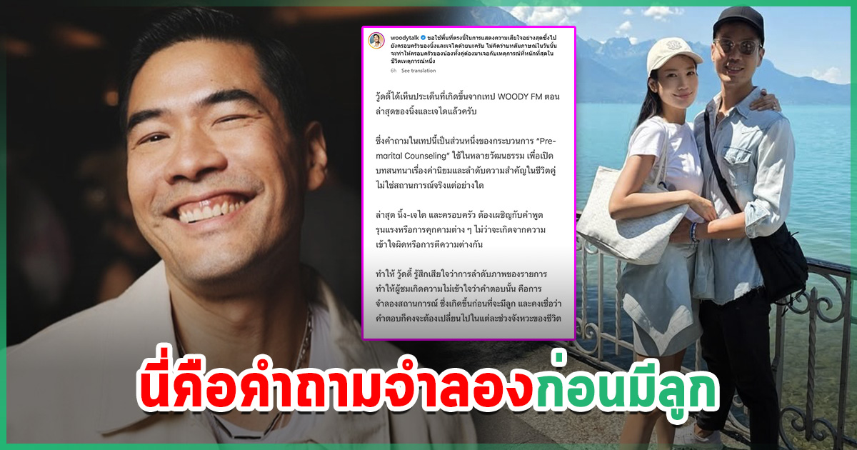 วู้ดดี้ โพสต์ขอโทษครอบครัว นิ้ง โศภิดา - เจได หลังบทสัมภาษณ์ในรายการทำให้เกิดดราม่าลุกลาม ยอมรับผิดการตัดต่ออาจทำให้การสื่อสารคลาดเคลื่อน กลายเป็นประเด็นดราม่าลุกลาม ที่หลายคนออกมาวิพากษ์วิจารณ์กันสนั่น สำหรับกรณีของอดีตนางงาม นิ้ง โศภิดา ที่ได้ไปออกรายการ WOODY FM Special และมีช่วงหนึ่งที่มีคำถามว่า “ถ้าสามีกับลูกจมน้ำพร้อมกัน แล้วคุณช่วยได้คนเดียว คุณจะเลือกช่วยใคร” โดย นิ้ง ได้ตอบกลับไปว่า “จะเลือกช่วยสามี” พร้อมให้เหตุผลว่า “สามีคือคู่ชีวิตที่จะอยู่ด้วยกันยามแก่” จนชาวเน็ตต่างเข้ามาคอมเมนต์ดุเดือดแบ่งเป็นสองฝ่ายทั้งเห็นด้วยและไม่เห็นด้วย ทำให้ เจได ต้องออกมาปกป้องครอบครัว พร้อมฟ้องกลับคอมเมนต์ที่เกินขอบเขตนั้น ล่าสุด (15 กรกฎาคม 2568) วู้ดดี้ วุฒิธร เจ้าของรายการ ก็ได้ออกมาแสดงความเสียใจและชี้แจงผ่านโพสต์ ระบุว่า คำถามดังกล่าวเป็นส่วนหนึ่งของกระบวนการ Pre‑marital Counseling หรือการปรึกษาก่อนแต่งงาน ซึ่งหลายวัฒนธรรมใช้เพื่อเปิดบทสนทนาเรื่องค่านิยมและลำดับความสำคัญในชีวิตคู่ ไม่ใช่สถานการณ์จริง แต่เมื่อเทปออกอากาศกลับทำให้เกิดความเข้าใจผิด จน นิ้ง เจได และครอบครัว ต้องเจอกับคำพูดรุนแรงและการคุกคาม โดย วู้ดดี้ ยอมรับว่า การลำดับภาพและการนำเสนอของรายการ อาจทำให้ผู้ชมไม่เข้าใจว่านี่คือคำถามจำลอง ซึ่งเกิดขึ้นตั้งแต่ก่อนที่ทั้งคู่จะมีลูก และคำตอบอาจเปลี่ยนแปลงไปตามช่วงชีวิตได้ พร้อมกับกล่าวขอโทษต่อครอบครัวของนิ้งและเจไดอย่างจริงใจ และยืนยันว่าจะนำเสียงสะท้อนทั้งหมดไปปรับปรุงการทำงาน นอกจากนี้ วู้ดดี้ ยังบอกอีกว่า อยากให้ทุกคนเคารพกันในฐานะมนุษย์ที่ก็มีความรู้สึกและเจ็บปวดได้เช่นกัน เราไม่คิดว่าบทสัมภาษณ์วันนั้นจะทำให้ครอบครัวของน้องทั้งคู่ต้องเจอกับเหตุการณ์ที่หนักขนาดนี้ ทีมงานจะระมัดระวังยิ่งขึ้น เพื่อไม่ให้เกิดความคลาดเคลื่อนหรือกระทบใจใครโดยไม่จำเป็น