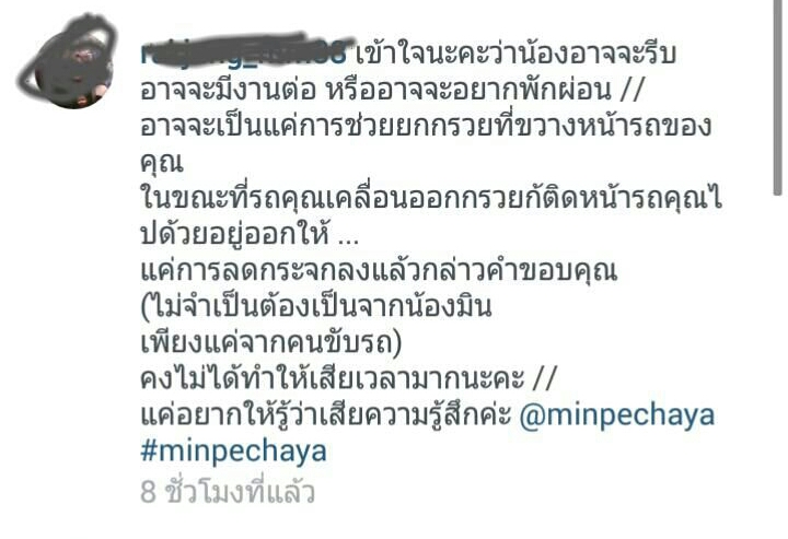 "เข้าใจนะคะว่าน้องรีบ อาจมีงานต่อ หรืออาจอยากพักผ่อน อาจจะแค่เป็นคนช่วยยกกรวยที่ขวางหน้ารถของคุณ ในขณะที่หากรถคุณเคลื่อนออกไปกรวยก็จะติดหน้ารถคุณไปด้วย แค่การลดกระจกลงแล้วกล่าวคำขอบคุณ (ไม่จำเป็นต้องเป็นจากน้องมิน เพียงแค่จากคนขับรถ) คงไม่ทำให้เสียเวลามากนะคะ แค่อยากให้รู้ว่าเสียความรู้สึกค่ะ"