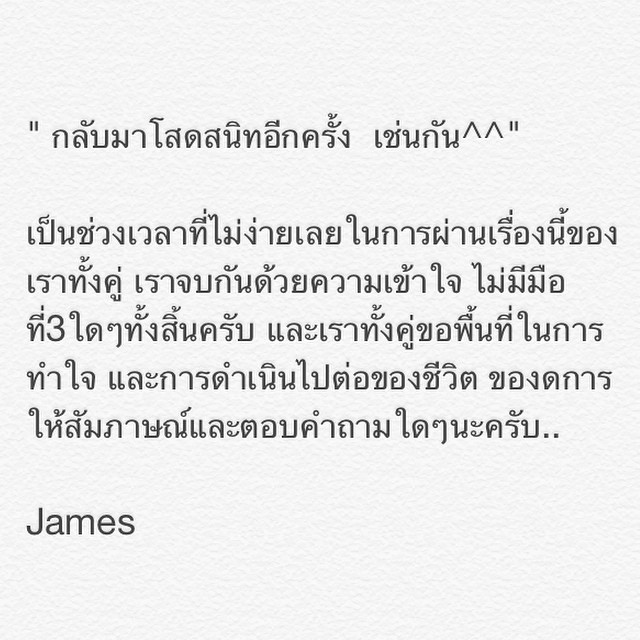 เหล่าแฟนคลับของวงการบันเทิงไทยเพิ่งจะใจหายกับการประกาศเลิกราของ เต๋อ ฉันทวิชช์ และ พีค ภัทรศยา แบบยังไม่หายช็อก ก็มีข่าวมาให้ช็อกอีกครั้ง เพราะล่าสุด (1 พฤศจิกายน 2557) นักร้องและนักแสดงหนุ่ม เจมส์ เรืองศักดิ์ ลอยชูศักดิ์ ก็ได้ออกมาโพสต์ข้อความลงในอินสตาแกรมว่าตอนนี้ได้เลิกรากับแฟนสาว เนย พีอาร์สาวแล้ว โดยระบุว่า "กลับมาโสดสนิทอีกครั้ง เช่นกัน ^^ เป็นช่วงเวลาที่ไม่ง่ายเลยในการผ่านเรื่องนี้ของเราทั้งคู่ เราจบกันด้วยความเข้าใจ ไม่มีมือที่ 3 ใด ๆ ทั้งสิ้นครับ และเราทั้งคู่ขอพื้นที่ในการทำใจ และการดำเนินไปต่อของชีวิต ของดการให้สัมภาษณ์และตอบคำถามใด ๆ นะครับ"