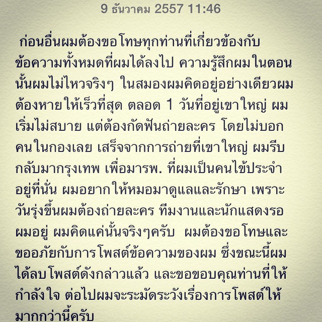 ล่าสุด (9 ธันวาคม 2557) ต่าย นัฐฐพนธ์ ก็ได้ออกมาโพสต์ข้อความขอโทษ โดยระบุว่า "ก่อนอื่นผมต้องขอโทษทุกท่านที่เกี่ยวข้องกับข้อความทั้งหมดที่ผมได้ลงไป ความรู้สึกผมในตอนนั้นผมไม่ไหวจริง ๆ ในสมองผมคิดอย่างเดียวผมต้องหายให้เร็วที่สุด ตลอด 1วัน ที่อยู่เขาใหญ่ ผมเริ่มไม่สบาย แต่ต้องกัดฟันถ่ายละคร โดยไม่บอกคนในกองเลย เสร็จจากการถ่ายที่เขาใหญ่ ผมรีบกลับมากรุงเทพ เพื่อมา รพ. ที่ผมเป็นคนไข้ประจำอยู่ที่นั่น ผมอยากให้หมอมาดูแลและรักษา เพราะวันรุ่งขึ้นผมต้องถ่ายละคร ทีมงานและนักแสดงรอผมอยู่ ผมคิดแค่นั้นจริง ๆ ครับ ผมต้องขอโทษและขออภัยกับการโพสต์ข้อความของผม ซึ่งขณะนี้ผมได้ลบโพสต์ดังกล่าวแล้ว และขอขอบคุณท่านที่ให้กำลังใจ ต่อไปผมจะระมัดระวังเรื่องการโพสต์ให้มากกว่านี้ครับ"