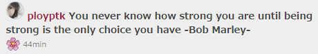 ขณะเดียวกัน พลอย ภัทรากร ได้โพสต์ข้อความลงในอินสตาแกรม ระบุว่า.. You never know how strong you are until being strong is the only choice you have -Bob Marley-