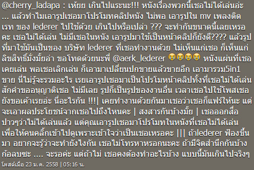 "@cherry_ladapa : เห้ยย เกินไปแระนะ !!! หนังเรื่องพวกนี้เชอไม่ได้เล่นอ่ะ ... แล้วทำไมเอารูปเชอมาโปรโมทคลิปหนัง ไม่พอ เอารูปใน mv เพลงติดเรท ของ lederer ไปใช้ด้วย เกินไปหรือเปล่า ??? จะทำกันขนาดนี้เลยเหรอคะ เชอไม่ได้เล่น ไม่มีเชอในหนัง เอารูปมาใช้เป็นหน้าคลิปก็ยังดี ???? แล้วรูปที่มาใช้มันเป็นของ บริษัท lederer ที่เชอทำงานด้วย ไม่เห็นแก่เชอ ก็เห็นแก่ลิขสิทธิ์มั่งไหมอ่า ขอโทษด้วยนะพี่ @aerk_lederer หนังแผ่นที่เชอเคยเล่น พอเชอเลิกเล่น ก็เอามาเปลี่ยนปกขายแล้วขายอีก เอามารวม 5 in 1 ขาย นี่ไม่รู้จะรวมอะไร เลยเอารูปเชอมาเป็นโปรโมหน้าคลิปทั้งที่เชอไม่ได้เล่น สักคำขออนุญาตเชอ ไม่มีเลย รูปก็เป็นรูปของงานอื่น เวลาเชอไปใช้โพสต์เชอยังขอเค้าเลยอ่ะ นี่อะไรกัน !!! เคยทำงานด้วยกันมาเชอว่าเชอก็แฟร์ให้นะ แต่จะเอาผลประโยชน์จากเชอไปถึงไหนคะ สงสารกันบ้างไหม เชอออกสื่อปาว ๆ ว่าไม่ได้เล่นแล้ว แต่คุณเอารูปเชอมาโปรโมทในหนังที่เชอไม่ได้เล่น เพื่อให้คนคลิกเข้าไปดูเพราะเข้าใจว่าเป็นเชอเหรอคะ ถ้า lederer ฟ้องขึ้นมา อยากจะรู้ว่าจะทำอย่างไรกัน เชอไม่โทรหาหรอกนะคะ ถ้ามีจิตสำนึกกันบ้างก็ลบซะ .... จะรอค่ะ แต่ถ้าไม่ เชอคงต้องทำอะไรบ้าง แบบนี้มันเกินไปจริง"