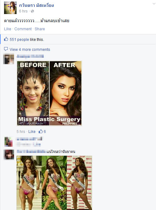 เพราะล่าสุด (26 มกราคม 2558) แอบเห็นเฟซบุ๊กของรุ่นพี่นางงามอย่าง แก้ม กวินตรา โพสต์ข้อความที่ดูเหมือนจะหมายถึงการประกวดมิสยูนิเวิร์ส 2014 ว่า "ตายแล้วววววววว.....ม้าแกลบเข้าเสย" ซึ่งก็มีแฟนคลับเข้ามาโพสต์ภาพของสาวงามจากประเทศหนึ่ง เปรียบเทียบกับภาพของม้า พร้อมบอกสาวแก้มว่า พูดถูกใจสุด ๆ
