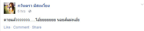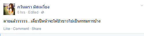 จากนั้นสาวแก้มก็โพสต์สเตตัสต่ออีกเรื่อย ๆ ว่า "ตายแล้ววววววว.....โอ้ยยยยยยย นอยส์แม่งเอ้ย" และ "ตายแล้วววววววว....ไม่ต้องเข้ามาถามค่ะ ไม่มีความคิดเห็นคือแบบ "เบิ่ดคำสิเว้า" ห่_ตำมึ_เอ้ย" ก่อนจะทิ้งท้ายว่า "ตายแล้วววววว...เดี๋ยวปีหน้าจะให้บัวขาวไปเป็นกรรมการบ้าง"