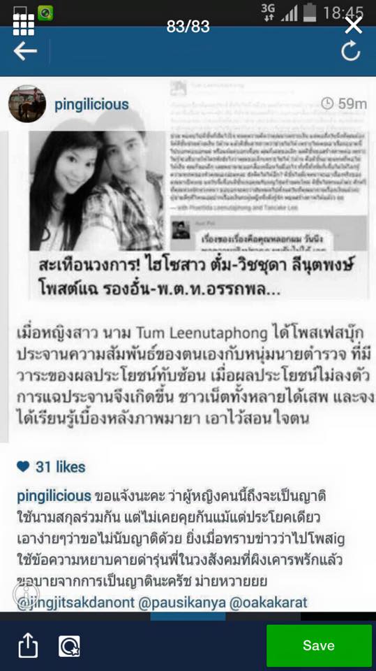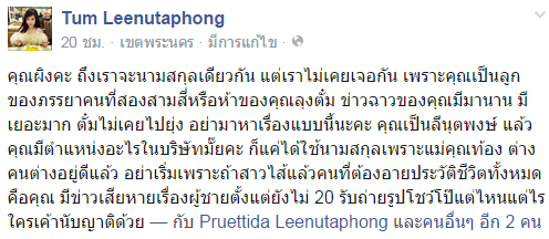 เรื่องนี้ทำเอา ไฮโซตั๋ม ถึงกับฉุน โพสต์ด่าจัดหนักผิงในเฟซบุ๊กส่วนตัวว่า... "คุณผิงคะ ถึงเราจะนามสกุลเดียวกัน แต่เราไม่เคยเจอกัน เพราะคุณเป็นลูกของภรรยาคนที่สองสามสี่หรือห้าของคุณลุงตั๋ม ข่าวฉาวของคุณมีมานาน มีเยอะมาก ตั๋มไม่เคยไปยุ่ง อย่ามาหาเรื่องแบบนี้นะคะ คุณเป็นลีนุตพงษ์ แล้วคุณมีตำแหน่งอะไรในบริษัทมั้ยคะ ก็แค่ได้ใช้นามสกุลเพราะแม่คุณท้อง ต่างคนต่างอยู่ดีแล้ว อย่าเริ่มเพราะถ้าสาวไส้แล้วคนที่ต้องอายประวัติชีวิตทั้งหมดคือคุณ มีข่าวเสียหายเรื่องผู้ชายตั้งแต่ยังไม่ 20 รับถ่ายรูปโชว์โป๊แต่ไหนแต่ไร ใครเขานับญาติด้วย"
