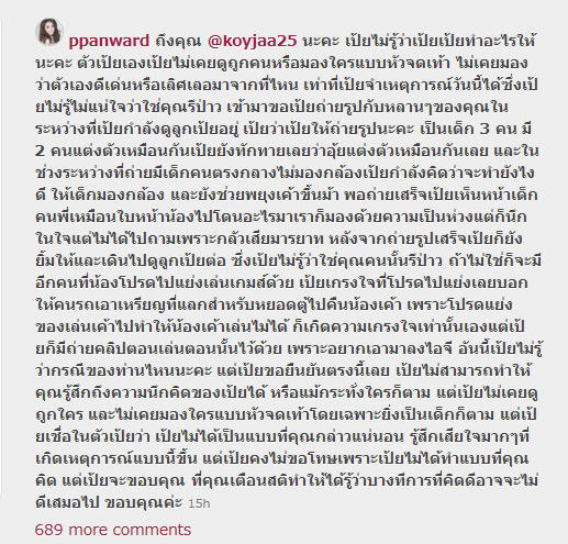"ppanward # ถึงคุณ @koyjaa25 นะคะ เป้ยไม่รู้ว่าเป้ยทำอะไรให้นะคะ ตัวเป้ยเองเป้ยไม่เคยดูถูกคนหรือมองใครแบบหัวจดเท้า ไม่เคยมองว่าตัวเองดีเด่นหรือเลิศเลอมาจากที่ไหน เท่าที่เป้ยจำเหตุการณ์วันนี้ได้ซึ่งเป้ยไม่รู้ไม่แน่ใจว่าใช่คุณรึป่าว เข้ามาขอเป้ยถ่ายรูปกับหลาน ๆ ของคุณในระหว่างที่เป้ยกำลังดูลูกเป้ยอยู่ เป้ยว่าเป้ยให้ถ่ายรูปนะคะ เป็นเด็ก 3 คน มี 2 คนแต่งตัวเหมือนกัน เป้ยยังทักทายเลยว่าอุ้ยแต่งตัวเหมือนกันเลย และในช่วงระหว่างที่ถ่ายมีเด็กคนตรงกลางไม่มองกล้องเป้ยกำลังคิดว่าจะทำยังไงดี ให้เด็กมองกล้อง และยังช่วยพยุงเค้าขึ้นมา พอถ่ายเสร็จเป้ยเห็นหน้าเด็กคนพี่เหมือนใบหน้าน้องไปโดนอะไรมาเราก็มองด้วยความเป็นห่วงแต่ก็นึกในใจแต่ไม่ได้ไปถาม เพราะกลัวเสียมารยาท หลังจากถ่ายรูปเสร็จเป้ยก็ยังยิ้มให้และเดินไปดูลูกเป้ยต่อ ซึ่งเป้ยไม่รู้ว่าใช่คุณคนนั้นหรือเปล่า ถ้าไม่ใช่ก็จะมีอีกคนที่น้องโปรดไปแย่งเล่นเกมด้วย เป้ยเกรงใจที่โปรดไปแย่ง เลยบอกให้คนรถเอาเหรียญที่แลกสำหรับหยอดตู้ไปคืนน้องเค้า เพราะโปรดแย่งของเล่นเค้าไปทำให้น้องเค้าเล่นไม่ได้ ก็เกิดความเกรงใจเท่านั้นเองแต่เป้ยก็มีถ่ายคลิปตอนเล่นตอนนั้นไว้ด้วย เพราะอยากเอามาลงไอจี อันนี้เป้ยไม่รู้ว่ากรณีของท่านไหนนะคะ แต่เป้ยขอยืนยันตรงนี้เลย เป้ยไม่สามารถทำให้คุณรู้สึกถึงความนึกคิดของเป้ยได้ หรือแม้กระทั่งใครก็ตาม แต่เป้ยไม่เคยดูถูกใคร และไม่เคยมองใครแบบหัวจรดเท้าโดยเฉพาะยิ่งเป็นเด็กก็ตาม แต่เป้ยเชื่อในตัวเป้ยว่า เป้ยไม่ได้เป็นแบบที่คุณกล่าวแน่นอน รู้สึกเสียใจมาก ๆ ที่เกิดเหตุการณ์แบบนี้ขึ้น แต่เป้ยคงไม่ขอโทษ เพราะเป้ยไม่ได้ทำแบบที่คุณคิด แต่เป้ยจะขอบคุณ ที่คุณเตือนสติทำให้ได้รู้ว่าบางทีการที่คิดดีอาจจะไม่ดีเสมอไป ขอบคุณค่ะ"