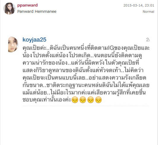 "Koyjaa25 คุณเป้ยค่ะ..ดิฉันเป็นคนหนึ่งที่ติดตาม IG ของคุณเป้ยและน้องโปรดตั้งแต่น้องโปรดเกิด จนตอนนี้ก็ยังติดตามดูความน่ารักของน้อง.. แต่วันนี้ผิดหวังในตัวคุณเป้ยที่แสดงกิริยาดูถูกหลานดิฉันตั้งแต่หัวจรดเท้า ไม่คิดว่าคุณเป้ยจะเป็นคนแบบนี้เลย อย่าแสดงความรังเกียจกันขนาดนี้ ชาติตระกูลฐานะหลานดิฉันไม่แพ้คุณเลยแม้แต่น้อย.. ไม่มีอะไรมาก แต่เสียความรู้สึกที่เคยชื่นชอบคุณเท่านั้นเองค่ะ"
