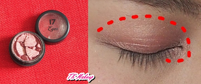 มาถึงดวงตาหน้าต่างของหัวใจ ใช้สีชมพูอ่อน (หรือถ้าใครชอบโทนส้ม โอรส ก็ได้เหมือนกัน) สีนี้เป็นสีที่โปรดปรานมาก เพราะมีเหลือบมุก ๆ ทอง ๆ น่ารักมุ้งมิ้งเลยทีเดียว แตกขนาดนี้ก็ยังไม่ทิ้งค่ะ ยังหาอันใหม่ไม่ได้ ทาให้ทั่วเปลือกตาบน เลยลงมาที่หัวตาล่าง จะใช้แปรงหรือนิ้วมือก็ตามถนัดเลยค่ะ