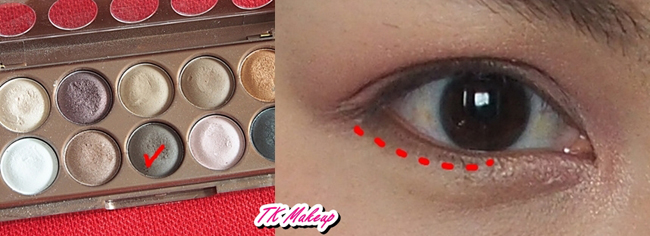 จากนั้นขอบตาล่าง ใช้สีน้ำตาลเข้มทาจากหางตาเลยกึ่งกลางตามาเล็กน้อย
