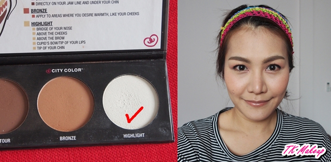และต่อด้วยไฮไลท์บริเวณโหนกแก้ม ใต้ตา สันจมูก โหนกคิ้ว คาง และเหนือริมฝีปาก ขั้นตอนนี้สำคัญนะ เพราะจะช่วยให้หน้าเราดูสว่าง มีเงาเล็ก ๆ แบบสาวผิวสุขภาพดี