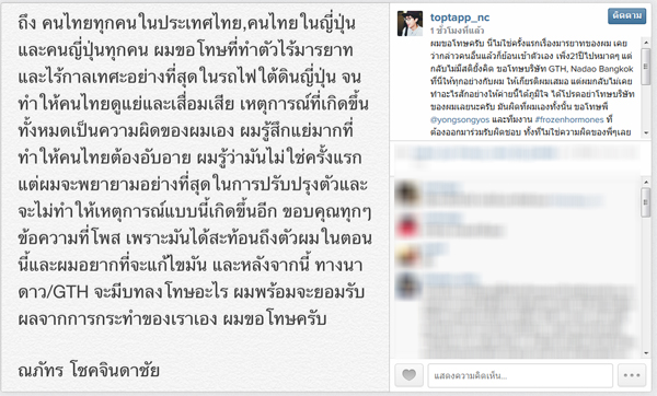 ท็อปแท็ป โพสต์ IG ยอมรับผิดกับเหตุการณ์ที่เกิดขึ้นในญี่ปุ่น วอนอย่าโทษบริษัท พร้อมขอเวลาแก้ไขตัวเอง
