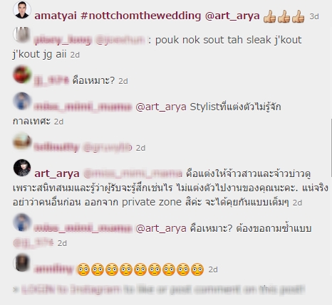 โดยเมื่อวันที่ 11 พฤษภาคม 2558 ได้มีผู้ใช้อินสตาแกรมรายหนึ่ง เข้าไปคอมเม้นท์ที่ IG amatyai ของ ใหญ่ อมาตย์ นิมิตภาคย์ ช่างภาพชื่อดัง ใต้รูปที่ถ่ายคู่กับ อาร์ต อารยา ในงานแต่งชมพู่ น็อต ว่า "Stylist ที่แต่งตัวไม่รู้จักกาลเทศะ" และถามซ้ำด้วยว่า "คือเหมาะ ?"