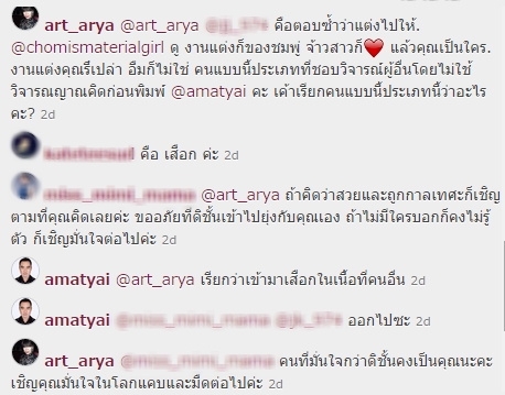 งานนี้ อาร์ต อารยา ก็ได้เข้ามาคอมเม้นท์ตอบกลับแบบจัดเต็มว่า "คือแต่งให้เจ้าสาวและเจ้าบ่าวดู เพราะสนิทสนมและรู้ว่าผู้รับจะรู้สึกเช่นไร ไม่แต่งตัวไปงานของคุณนะคะ แน่จริงอย่าว่าคนอื่นก่อน ออกจาก private zone สิคะ จะได้คุยกันแบบเต็ม ๆ" และ "คือตอบซ้ำว่าแต่งไปให้ @chomismaterialgirl ดู งานแต่งก็ของชมพู่ เจ้าสาวก็ (ไอคอนหัวใจ) แล้วคุณเป็นใคร งานแต่งคุณรึเปล่า อืมก็ไม่ใช่ คนแบบนี้ประเภทที่ชอบวิจารณ์ผู้อื่นโดยไม่ใช้วิจารณญาณคิดก่อนพิมพ์ @amatyai คะ เค้าเรียกคนแบบนี้ประเภทนี้ว่าอะไรคะ ?"
