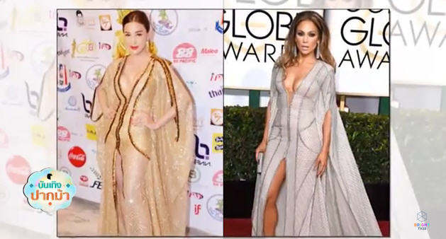 ม้า อรนภา ไม่จบ ชุดตาข่ายสีทองของ เปิ้ล ไอริณ บอกว่าเลียบแบบมาจากชุดของ เจนนิเฟอร์ โลเปซ แต่ชุดดูราคาไม่ถึงแสน เหมือนเอาริบบิ้นมาแปะไว้
