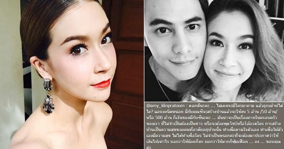 โดย เอมี่ ได้โพสต์ข้อความว่า "ตลกดีนะคะ...ไม่เคยจะมีใครมาถาม แล้วถูกเม้าท์ได้ไง ? แอบงงนิดหน่อย มี่กับคุณซีจะสร้างบ้านแล้วจะใช้งบ 5 ล้าน 50 ล้าน หรือ 500 ล้าน ก็เงินของมี่กับซีนะคะ... มันน่าจะเป็นเรื่องภายในครอบครัวของเราที่ไม่จำเป็นต้องเป็นข่าว หรือจะต้องพูดโชว์หรือโอ้อวดใคร การสร้างบ้านเป็นความสุขของคนที่อาศัยอยู่บ้านนั้น ทำเพื่อตามใจตัวเอง ทำเพื่อให้ตัวเองมีความสุข ไม่ได้ทำเพื่อใคร ไม่จำเป็นหรอกค่ะที่จะต้องมาประกาศว่าใช้เงินไปเท่าไร บอกว่าใช้น้อยก็งก บอกว่าใช้มากก็ฟุ่มเฟือย...งง... ขอบคุณค่ะ"