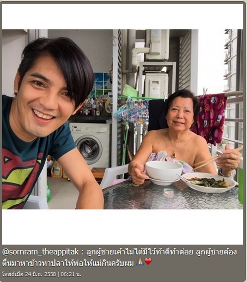 ล่าสุด (25 มิถุนายน 2558) นอกจากในจอจะเป็นพระเอกแล้ว หนุ่ม ศรราม ยังได้เผยถึงความเป็นพระเอกนอกจอ โดยที่โพสต์รูปของคุณแม่ขณะนั่งรับประทานอาหาร พร้อมข้อความว่า "ลูกผู้ชายเขาไม่ได้มีไว้ท้าตีท้าต่อย ลูกผู้ชายต้องตื่นมาหาข้าวหาปลาให้พ่อให้แม่กินครับผม"