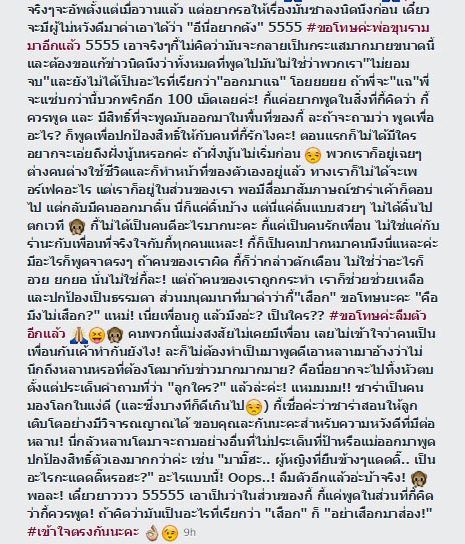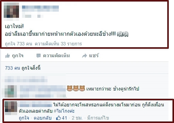 แต่ทว่าในเวลาต่อจากนั้นไม่นาน เพื่อนสาวคนสนิทของสาวซาร่าอีกคน ก็ได้โพสต์สเตตัสเฟซบุ๊กลอย ๆ ว่า "เอาใหม่ ! อย่าลืมเอาขึ้นมาก่ายหน้าผากตัวเองด้วยนะอีช้าง !!!" พร้อมระบุในคอมเม้นท์อีกว่า ความจริงไม่ได้อยากโพสต์หรอก ในเมื่อติ่งฝ่ายนู้นมโนมาก่อน ฝ่ายนี้เลยขอเป็นติ่งเพื่อนตัวเองด่ากลับ