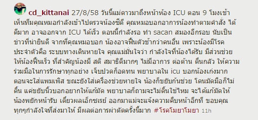 จากที่คุณหมอบอกน้องอาจฟื้นตัวช้ากว่าคนอื่น เพราะน้องมีโรคประจำตัวคือระบบทางเดินหายใจ คุณแม่มั่นใจว่า กำลังใจที่น้องได้รับมีส่วนช่วยให้น้องฟื้นเร็ว ที่สำคัญน้องมีสติ สมาธิดีมาก ๆ ไม่มีอาการต่อต้าน ตื่นกลัว ให้ความร่วมมือในการรักษาทุกอย่าง เจ็บปวดก็อดทน พยาบาลใน icu บอกน้องเก่งมาก ตอนจะใส่แพมเพิสขณะยังใส่เครื่องช่วยหายใจ น้องก็ขยับก้นช่วย โดนมัดมือก็ไม่ดิ้น แค่ขยับนิ้วบอกอยากให้แก้มัด พยาบาลก็ถามจะไม่ดิ้นใช่ไหมจะได้แก้มัดให้ น้องพยักหน้ารับ