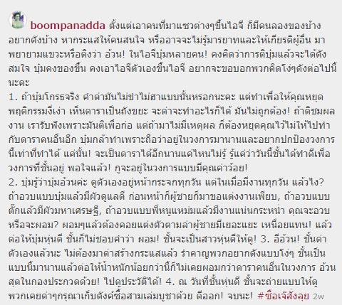โดยบุ๋ม ปนัดดา เปิดเผยว่า เธออ้วนขึ้นมากประมาณ 5 กิโลกว่า พอออกทีวีแล้วก็เลยยิ่งดูตัวใหญ่ แต่ขอตนนั้นน้ำหนักที่ออกนั้นมันออกหน้าอก ออกแก้ม สำหรับกรณที่เกิดขึ้นตนไม่โกรธ เพราะถ้าโกรธจริง ๆ คงไม่พิมพ์แคปชั่นยาวขนาดนั้น แต่ถ้าโกรธจริง ๆ ตนจะเดินหนีดีกว่า หรือไม่ก็มีปัญหาอะไรก็จะเคลียร์เลย และถ้าโมโหจริง ๆ ก็ตามถึงบ้าน สำหรับกรณีที่มีคนด่าว่าอีอ้วนทั้งสองนี้ ถือว่ากระจอก เพราะตนเคยโดนมาเยอะกว่านี้