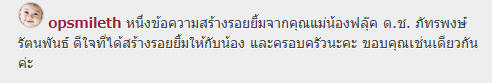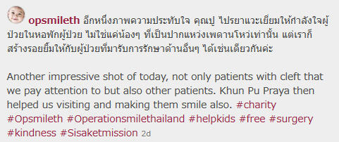 งานนี้ไม่ใช่แค่น้อง ๆ ที่เป็นปากแหว่งเพดานโหว่เท่านั้น แต่ผู้ป่วยที่มารักษาตัวด้วยโรคอื่น ๆ ต่างก็ได้รับรอยยิ้มและกำลังใจกันอย่าวถ้วนหน้า พร้อมกันนี้สาวปู ไปรยา ยังได้นำภาพแห่งรอยยิ้มจากกิจกรรมดังกล่าว มาร่วมแชร์ความประทับใจของเธอต่อประสบการณ์ในครั้งนี้ด้วย