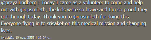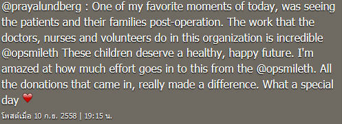 "หนึ่งในช่วงเวลาที่ประทับใจของฉันในวันนี้ คือการได้เห็นผู้ป่วยและครอบครัวของพวกเขาภายหลังการผ่าตัด งานที่แพทย์ พยาบาล และอาสาสมัครได้ทำในองค์กรนี้คือสิ่งที่น่าเหลือเชื่อ เด็ก ๆ เหล่านี้สมควรได้รับสุขภาพที่ดีและอนาคตที่มีความสุข ฉันรู้สึกตื่นใจกับความพยายามในการทำสิ่งเหล่านี้ของมูลนิธิสร้างรอยยิ้ม ทุกการบริจาคที่หลั่งไหลเข้ามา สามารถสร้างสิ่งที่แตกต่างได้ริง ๆ ช่างเป็นวันที่วิเศษอะไรเช่นนี้"