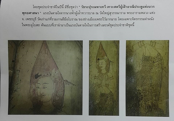 โดยชุดดังกล่าวมีชื่อชุดว่า "วัชระปุระมหาเทวี เทวะสตรีผู้เฝ้าธรณีประตูแห่งบวรพระพุทธศาสนา" โดยได้แรงบันดาลใจจากจิตรกรรมฝาผนังของวัดใหญ่สุวรรณาราม พระอารามหลวง จ.เพชรบุรี ที่เป็นภาพของ วัชระปุระมหาเทวี เทวะสตรีผู้เฝ้าธรณีประตูแห่งบวรพระพุทธศาสนา