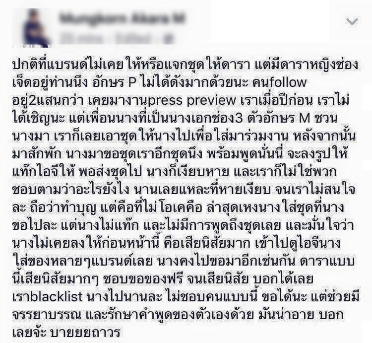 กลายเป็นข่าวเม้าท์มอยกันสนั่นวงการบันเทิงทีเดียว หลังห้องเสื้อชื่อดังออกมาโพสต์แฉพฤติกรรมของดาราสาวช่อง 7 อักษรย่อ P เพื่อนของนางเอกฮอตตัวย่อ M ช่อง 3 หลังชอบตีเนียนขอชุดฟรี แถมไม่ยอมคืนและไม่ยอมให้เครดิตลงในอินสตาแกรม [อ่านข่าว อุ๊ตะเม้าท์มอย ! ดาราสาวช่อง 7 เนียนขอชุดฟรี-ไม่ยอมคืน]