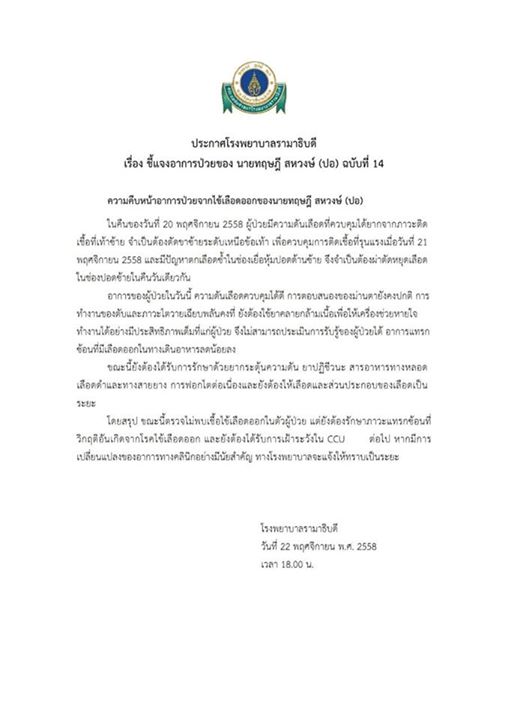 วันที่ 22 พฤศจิกายน 2558 คณะแพทย์โรงพยาบาลรามาธิบดี ได้ออกแถลงฉบับที่ 14 โดยระบุว่า ในคืนวันที่ 20 พฤศจิกายน 2558 ผู้ป่วยมีความดันเลือดที่ควบคุมได้ยากจากภาวะติดเชื้อที่เท้าซ้าย จำเป็นต้องตัดขาซ้ายระดับเหนือข้อเท้า ปอ ทฤษฎี เพื่อควบคุมการติดเชื้อที่รุนแรง