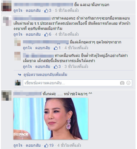 โดยรายการเดอะเฟซฯ ตอนล่าสุดที่ผ่านมา เมื่อวานนี้ (21 พฤศจิกายน 2558) ก็มีชอตที่สาวคริสต้องเดินผ่านหน้าเมนเทอร์ลูกเกด ซึ่งสาวคริสได้เดินก้มหลังและเอามือช้อนกระโปรงเดินผ่านไป ถือได้ว่าเป็นสิ่งที่ไม่ค่อยได้เห็นในเด็กสมัยนี้เท่าไรนัก