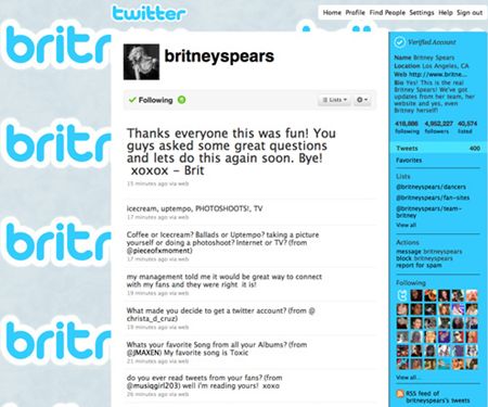 ดาราฮอลลีวู้ดที่เป็นผู้นำในการใช้ทวิตเตอร์คือ แอชตัน คุตเชอร์ สามีละอ่อนของเดมี มัวร์ ซึ่งก็พาน้าเดมีมาทวิตโชว์อยู่บ่อยครั้ง คุตเชอร์มีแฟนๆ ติดตามอยู่ราว 4 ล้านกว่าคน ได้ฉายาว่า "ราชาทวิต" อย่างไม่เป็นทางการ แต่ล่าสุด บริตนีย์ สเปียร์ส มาจากไหนไม่ทราบแซงหน้าไปเป็น 5 ล้านคนรายแรก