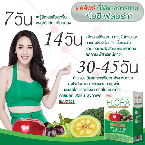 "โอซี ฟลอร่า" เป็นอาหารเสริมที่สกัดจากธรรมชาติ 100% ไม่ว่าจะเป็น สารสกัดจากแอปเปิล, สารสกัดบลอคโคลี, ผงพรุน, สารสกัดจากส้มแขก, โคลีน ไบทาร์เทรต, โซเดียม คอปเปอร์ คลอโรฟิลลิน, อนูลิน และโอลิโกฟรุคโตส ซึ่งรวม ๆ กันแล้วจะสามารถช่วยขจัดของเสียสะสม สารตกค้าง และช่วยล้างสารพิษในร่ายกายได้ดี เช่น ในตับ ลำไส้ ไต และหลอดเลือด นอกจากนี้ยังช่วยเพิ่มภูมิคุ้มกัน ป้องกันโรคต่าง ๆ ลดคอเลสเตอรอล ควบคุมระดับน้ำตาลในเลือด ช่วยลดการสะสมไขมัน ลดพุง ช่วยระบบขับถ่าย ผิวพรรณสดใส เรียกได้ว่าทำให้ภายในไม่ตกค้าง ภายนอกสดชื่นกระปรี้กระเปร่า สุขภาพดี ห่างไกลโรค ปลอดภัย และไร้สารตกค้างอีกด้วย