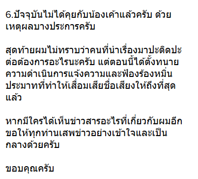 ทั้งนี้ปัจจุบันได้เลิกคุยกันแล้ว เนื่องด้วยเหตุผลบางประการ สุดท้ายขอให้ทุกท่านเสพสื่ออย่างเข้าใจ และมีความเป็นกลางด้วย ขอบคุณครับ