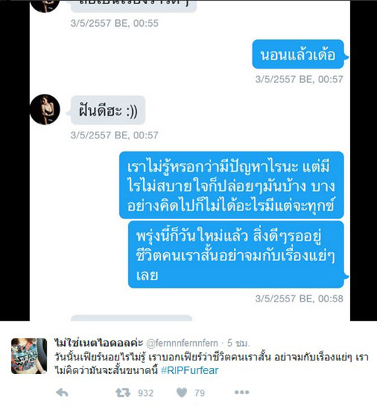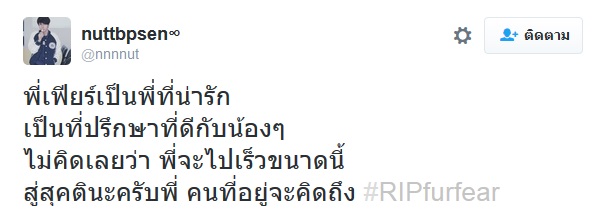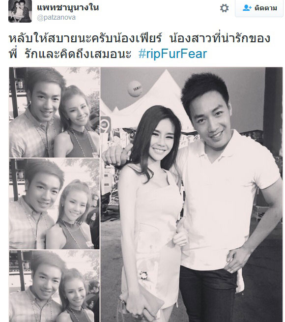 ทั้งนี้บรรดาเพื่อนสนิทรวมถึงคนในโลกออนไลน์ ต่างติดแท็ก #ripfurfear เพื่อไว้อาลัยกันอย่างมากมาย โดยส่วนมากบอกว่า สาวเซ็กซี่คนนี้นิสัยดีน่ารักและเป็นกันเอง ถึงไม่รู้จักกันเป็นการส่วนตัว แต่เห็นข้อความผ่านทวีตและสเตตัสก็รู้สึกได้ว่าเฟียร์เป็นคนที่มีความคิด ใส่ใจทุกคนรอบข้าง และมักจะมีข้อความดี ๆ มาให้ชาวโซเชียลรีทวีตอยู่เรื่อย ๆ การจากไปแบบกะทันหันทำให้ทุกคนทำใจไม่ได้.. แต่ในเมื่อเป็นความจริง ก็ต้องส่งเฟียร์ไปเป็นนางฟ้าคนสวยบนสวรรค์