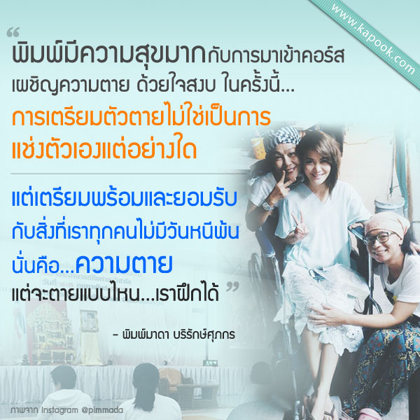 "สรุปสิ่งที่ได้เรียนรู้มาฝากนะคะ พิมพ์มีความสุขมากกับการมาเข้าคอร์ส เผชิญความตาย ด้วยใจสงบ ในครั้งนี้ การเตรียมตัวตายไม่ใช่เป็นการแช่งตัวเองแต่อย่างใด แต่เตรียมพร้อมและยอมรับกับสิ่งที่เราทุกคนไม่มีวันหนีพ้น นั่นคือ ความตาย แต่จะตายแบบไหนเราฝึกได้ กราบพระอาจารย์ ไพศาล วิสาโล"