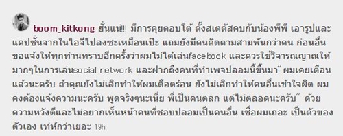 "ฮั่นแน่ มีการคุยตอบโต้ ตั้งสเตตัสคบกับน้องพีพี เอารูปและแคปชั่นจากในไอจีไปลงซะเหมือนเป๊ะ แถมยังมีคนติดตามสามพันกว่าคน ก่อนอื่นขอแจ้งให้ทุกท่านทราบอีกครั้งว่าผมไม่ได้เล่นเฟซบุ๊ก และควรใช้วิจารณญาณให้มาก ๆ ในการเล่น social network